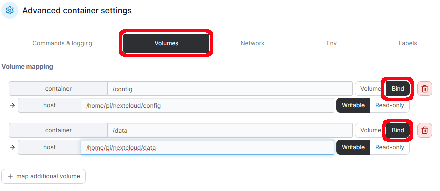 Es muss ein /config und ein /data Volume eingerichtet werden. Das /config Verzeichnis wird auf /home/pi/nextcloud/config, das /data Verzeichnis auf /home/pi/nextcloud/data gemappt. Dabei darauf achten, dass Bind markiert ist.
