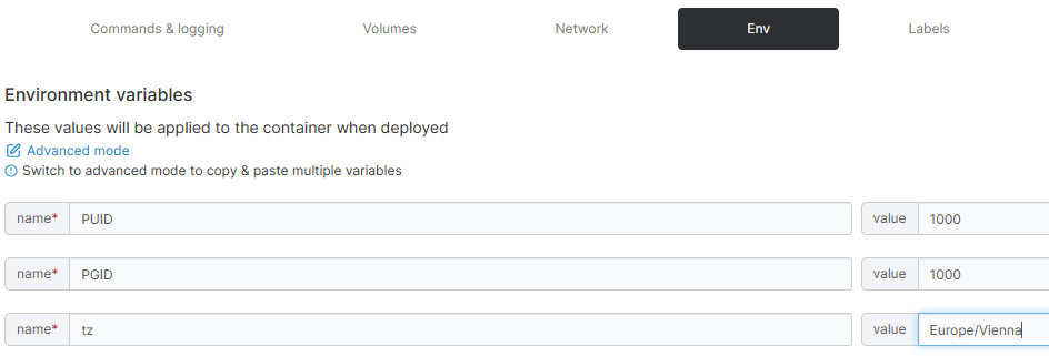 Sowohl PUID als auch PGID mit dem Wert 1000 eintragen. Das Betrifft hier den User Pi. Kontrolliert werden kann PUID und PGID mit dem Befehl