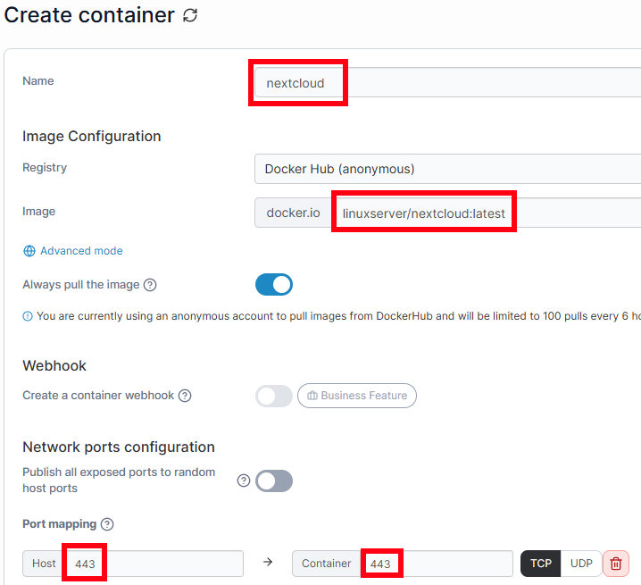 Als Name nextcloud eingeben. Im Feld Image wird linuxserver/nextcloud:latest eingegeben. Als Portmapping auf beiden Seiten 443 eingeben.
