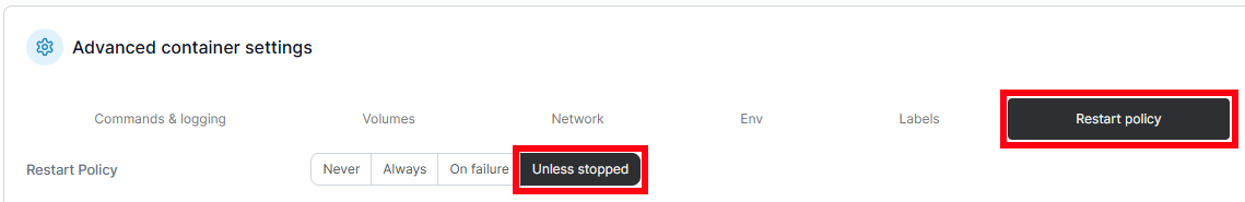 In den Advanced controler settings die Restart policy auf Unless stopped festlegen.