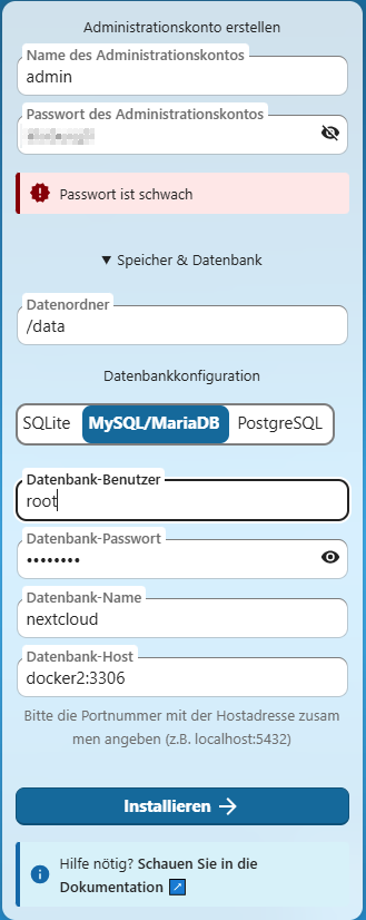 Nextcloud wird mit https://docker2:443 aufgerufen. Die Sicherheitsbedenken der diversen Browser großzügig ignorieren. Beim ersten Aufruf müssen noch Einstellungen vorgenommen werden. Name und Passwort des Administratorkontos nach den jeweiligen Bedürfnissen eintragen. Der Datenordner ist bereits eingetragen. als Datenbank wird die bereits erstellte MariaDB eingestellt. Der Datenbank-Benutzer ist root, das Datenbank-Passwort ist das bei der Installation vergebene k0. Der Datenbank-Name ist nextcloud und der Datenbank-Host liegt auf docker2:3306.