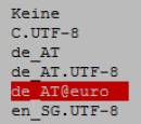 In der im linken Bild gezeigten Konfiguration den Punkt de_AT@euro markieren und bestätigen. Dadurch wird das mit [Alt Gr]+e erzeugte Euro-Zeichen [] richtig dargestellt.